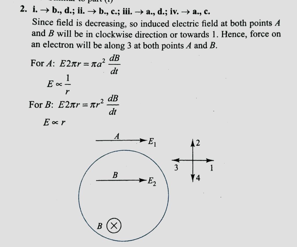 A uniform but time varying magnetic field B (t ) exists in a cylindrical region of radius a and is directed into the plane of the paper,as shown in figure. THe magnetic field decreases at a constant rate inside the region. If r is the distance from the axis of the cylindrical region, then match column I with column II.