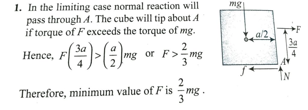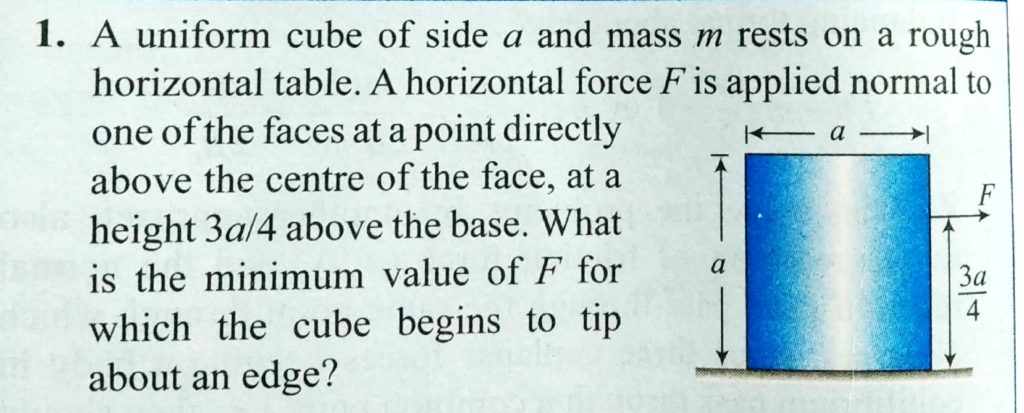A uniform cube of side a and mass m rests on a rough horizontal table. A horizontal force F is applied normal to one of the faces at a point that is directly above the centre of the face, at a height 3a/4 above the base. The minimum value of F which the cube begins to tip about the edge is ….(Assume that the cube does not slide).
