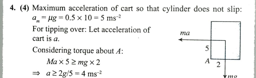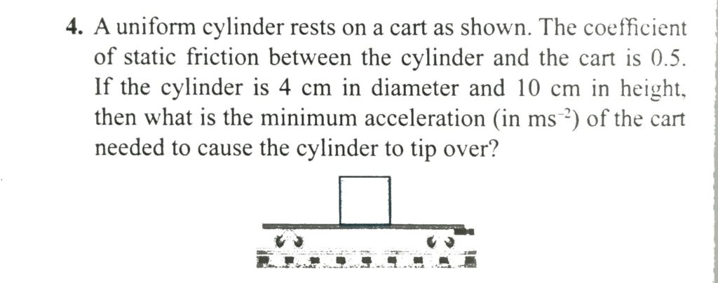 A uniform cylinder rests on a cart as shown. The coefficient of static friction between the cylinder and the cart is 0.5 If the cylinder is 4cm in diameter and 10cm in height, which of the following is the minimum acceleration of the cart needed to cause the cylinder to tip over ?