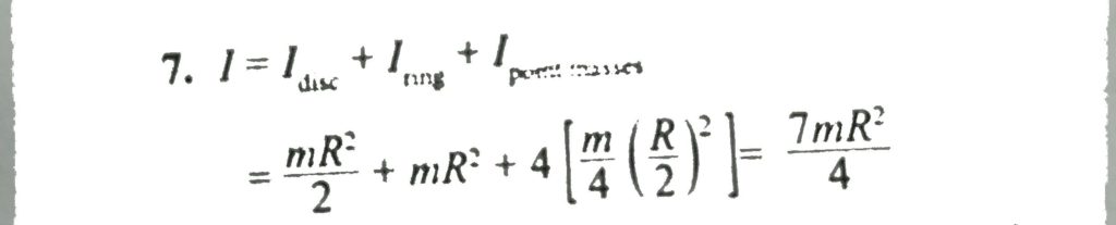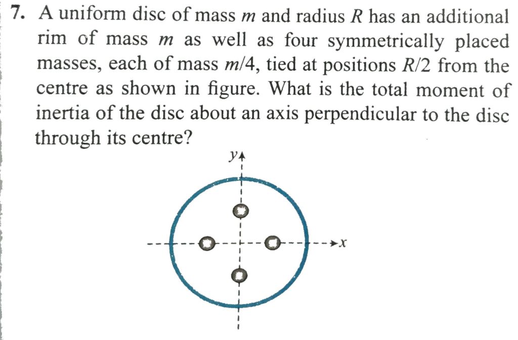 A uniform disc of mass m and radius R has an additional rim of mass m as well as four symmetrically placed masses, each of mass m/4 tied at positions R/2 from the centre as shown in Fig. What is the total moment of inertia of the disc about an axis perpendicular to the disc through its centre?