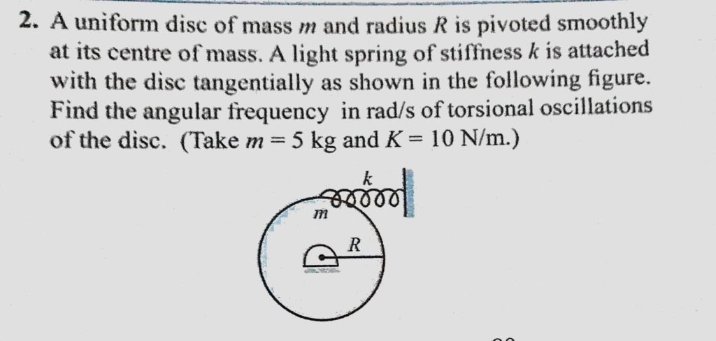 A uniform disc of mass m and radius R is pivoted smoothly at its centre of mass. A light spring of stiffness k is attached with the disc tangentially as shown in the following figure. A uniform disc of mass m and radius R is pivoted smoothly at its centre of mass. A light spring of stiffness k is attached with the disc tangentially as shown in the following figure. October 31, 2020 Category: Uncategorised (JEE Advanced Physics by BM Sharma + GMP Solutions) , Facebook Messenger WhatsApp Share this:TwitterFacebook Related