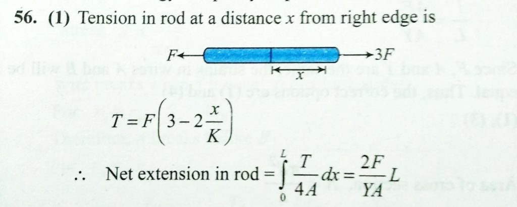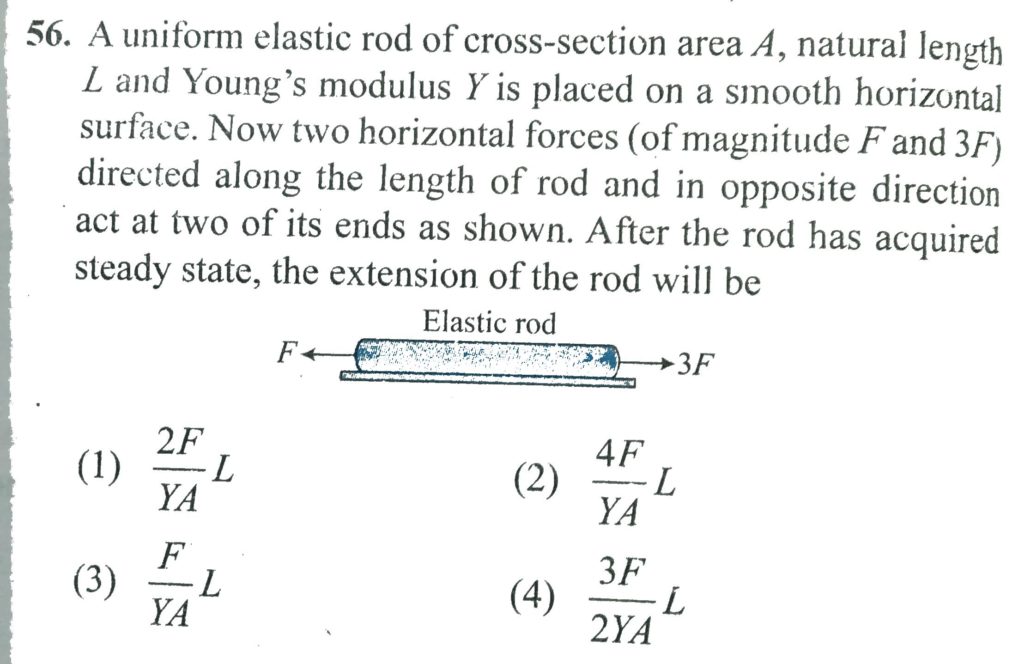 A uniform elastic rod of cross section area A natural length L and Young’s modulus Y is placed on a smooth horizontal surface. Now two horizontal forces (of magnitude F and 3F) directed along the length of rod and in opposite direction act at two of its ends as shown . After the rod has acquired steady state, the extension of the rod will be