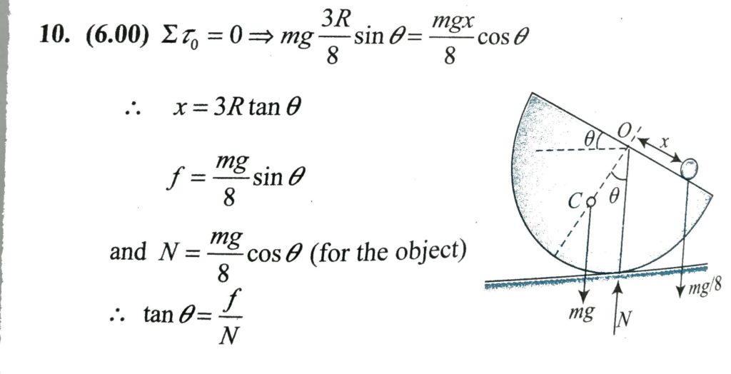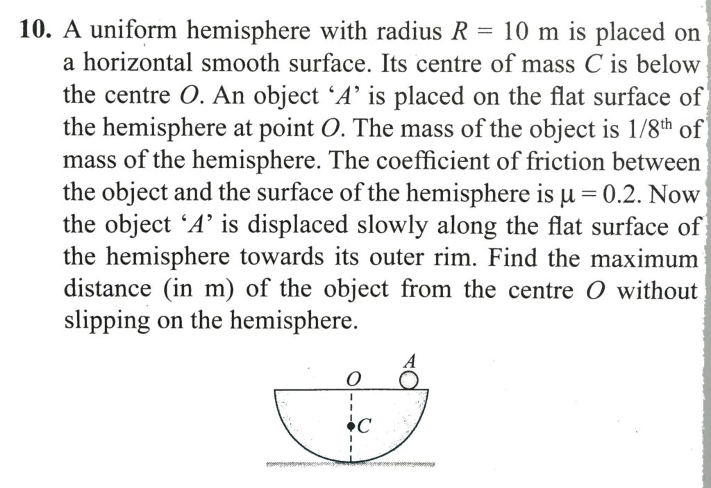 A uniform hemisphere with radius R = 10 m is placed on a horizontal smooth surface. Its centre of mass C is below the centre O. A uniform hemisphere with radius R = 10 m is placed on a horizontal smooth surface. Its centre of mass C is below the centre O. September 26, 2020 Category: Uncategorised (JEE Advanced Physics by BM Sharma + GMP Solutions) , Facebook Messenger WhatsApp Share this:TwitterFacebook Related