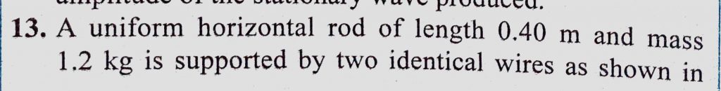 A uniform horizontal rod of length 0.40 m and mass 1.2 kg is supported by two identical wires as shown in figure. Where should a mass of 4.8 kg be placed on the rod, so that the same tuning A uniform horizontal rod of length 0.40 m and mass 1.2 kg is supported by two identical wires as shown in figure. Where should a mass of 4.8 kg be placed on the rod so that the same tuning November 5, 2020 Category: Uncategorised (JEE Advanced Physics by BM Sharma + GMP Solutions) , Facebook Messenger WhatsApp Share this:TwitterFacebook Related