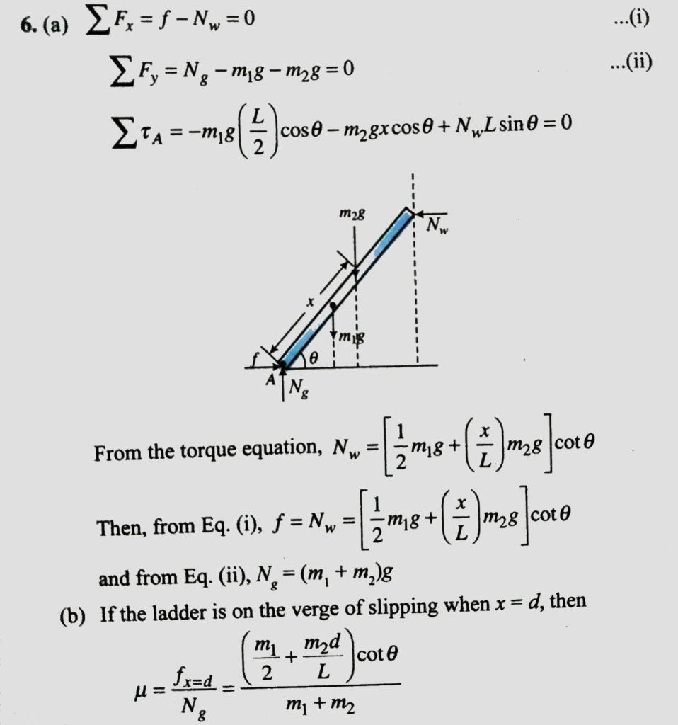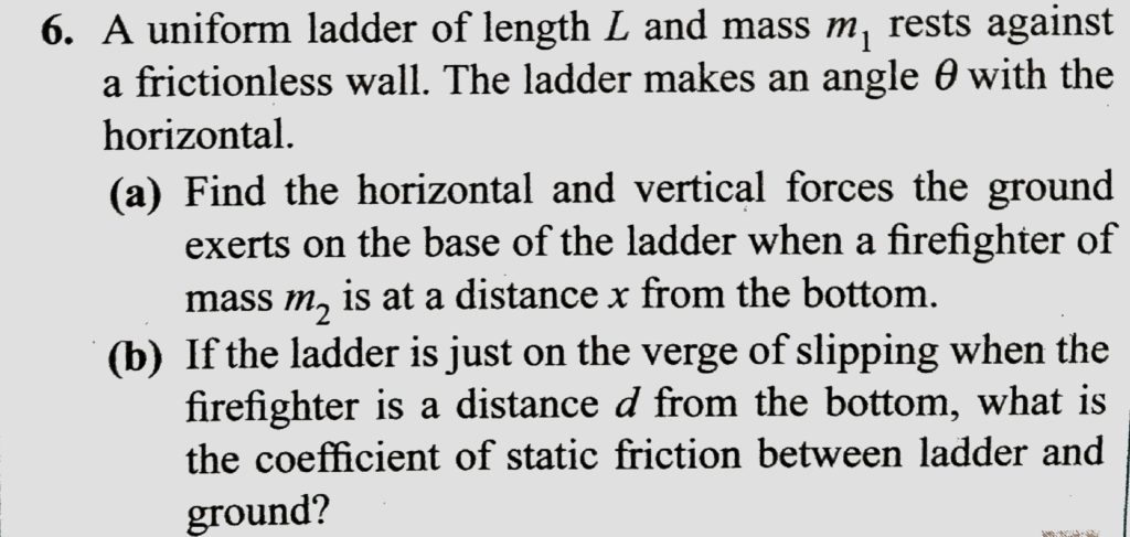 A uniform ladder of length L and mass m1 rests against a frictionless wall. The ladder makes an angle θ with the horizontal. (a) Find the horizontal and vertical forces the ground exerts on the base of the ladder when a fire fighter of mass m2 has climbed a distance x along the ladder from the bottom. (b) If the ladder is just on the verge of slipping when the fire fighter is a distance d along the ladder from the bottom, what is the coefficient of static friction between ladder and ground?