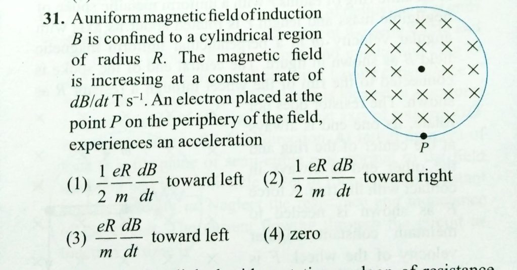 A uniform magnetic field of induction B is confined to a cylindrical region of radius R. The magnetic field is increasing at a constant rate of db / dt T/s. An electron placed at the point P on the periphery of the field, experiences an acceleration An equilateral triangular loop ADC having some resistance is pulled with a constant velocity v out of a uniform magnetic field directed into the paper (figure). At time t=0 side DC of the loop is at edge of the magnetic field. The induced current (i) versus time (t) graph will be as October 20, 2020 Category: Uncategorised (JEE Advanced Physics by BM Sharma + GMP Solutions) , Facebook Messenger WhatsApp Share this:TwitterFacebook Related