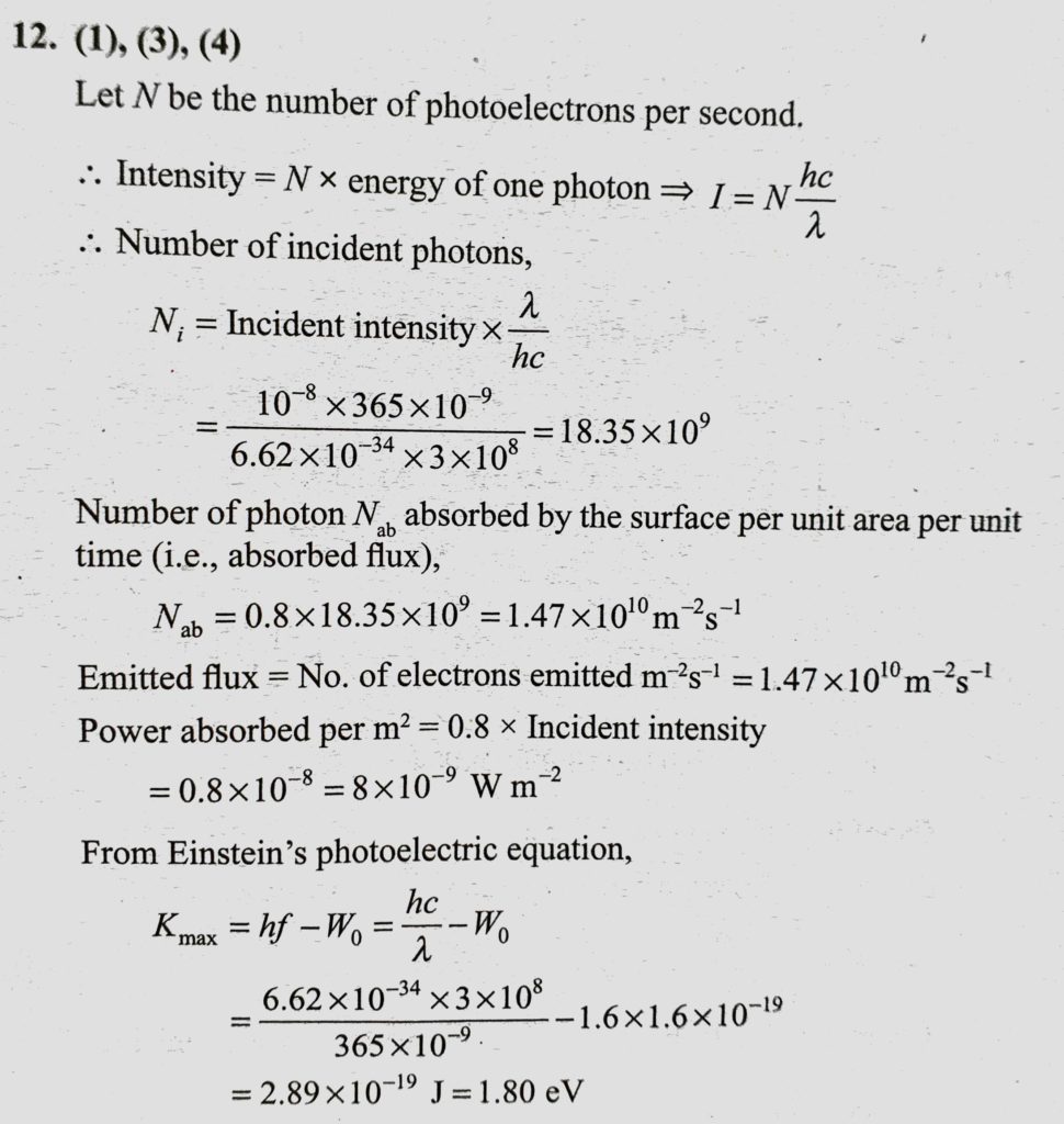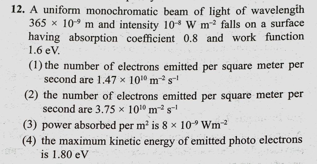 A uniform monochromatic beam of light of wavelength 365 * 10^-9 m and intensity 10^-8 W/m^2 falls on a surface having absorption coefficient 0.8 and work function 1.6 eV. A uniform monochromatic beam of light of wavelength 365 * 10^-9 m and intensity 10^-8 W/m^2 falls on a surface having absorption coefficient 0.8 and work function 1.6 eV. October 14, 2020 Category: Uncategorised (JEE Advanced Physics by BM Sharma + GMP Solutions) , Facebook Messenger WhatsApp Share this:TwitterFacebook Related