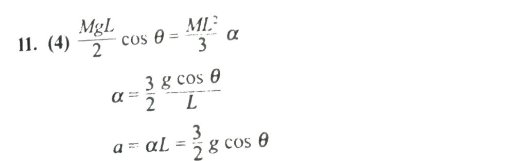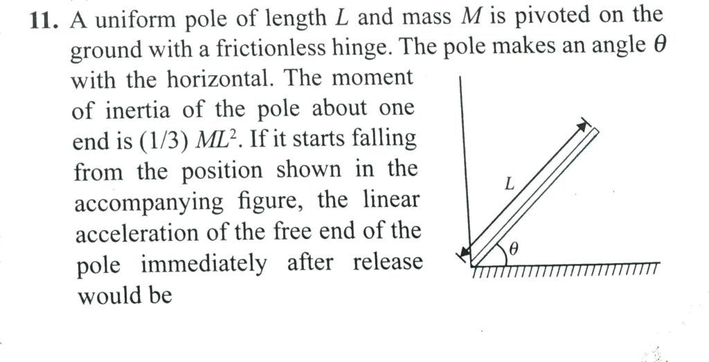 A uniform pole of length L and mass M is pivoted on the ground with a frictionless hinge. The pole makes an angle θ with the horizontal. The moment of inertia of the pole about one end is 3 1 ML 2 . If it starts falling from the position shown in the accompanying figure, the linear acceleration of the free end of the pole immediately after release would be :