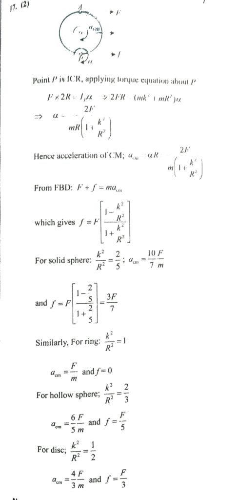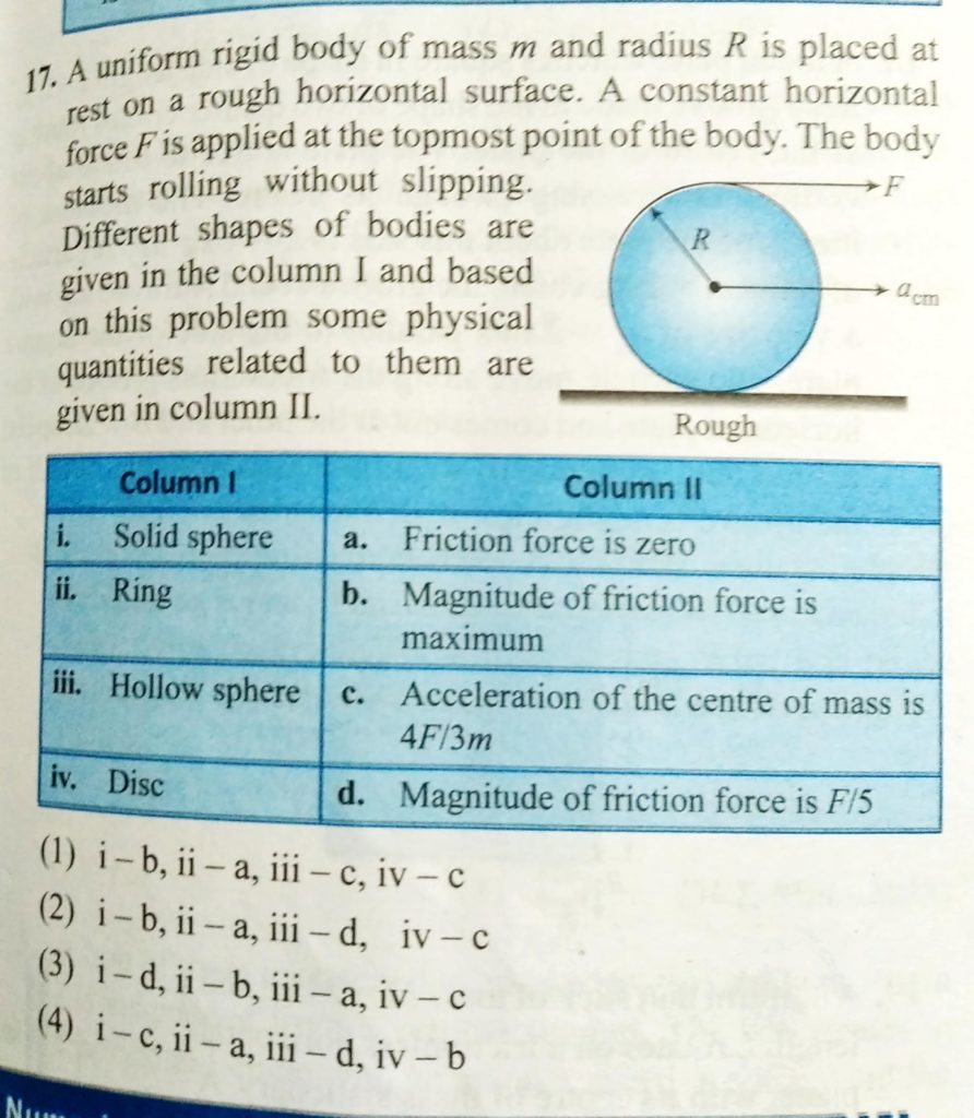 A uniform rigid body of mass m and radius R is placed at rest on a rough horizontal surface. A constant horizontal force F is applied at the topmost point of the body. THe body starts rolling without sipping. A uniform yo-yo (longer radius R F 2 F 3 and F 4 are applied separately as shown. small radius r) is resting on a perfectly rough horizontal table. This equation should be attempted after forces F 1 September 30, 2020 Category: Uncategorised (JEE Advanced Physics by BM Sharma + GMP Solutions) , Facebook Messenger WhatsApp Share this:TwitterFacebook Related