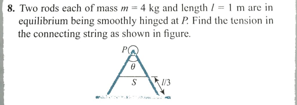 Two rods each of mass m = 4 kg and length l = 1 m are in equilibrium being smoothly hinged at P. Find the tension in the connecting string as shown in figure. Two rods each of mass m = 4 kg and length l = 1 m are in equilibrium being smoothly hinged at P. Find the tension in the connecting string as shown in figure. September 26, 2020 Category: Uncategorised (JEE Advanced Physics by BM Sharma + GMP Solutions) , Facebook Messenger WhatsApp Share this:TwitterFacebook Related