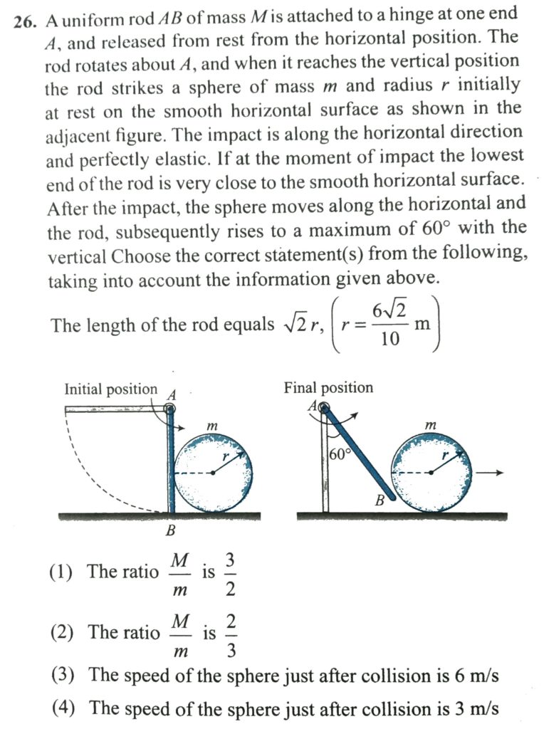 A uniform rod AB of mass M is attached to a hinge at one end A, and released from rest from the horizontal position. The rod rotates about A, and when it reaches the vertical position the rod strikes a sphere of mass m and radius r initially at rest on the smooth horizontal surface as shown in the adjacent figure. The impact is along the horizontal direction and perfectly elastic. If at the moment of impact, the lowest end of the rod is very close to the smooth horizontal surface. After the impact, the sphere moves along the horizontal and the rod, subsequently rises to a maximum of 60owith the vertical. Choose the correct statement(s) form the following, taking into account the information given above. The length of the rod equals