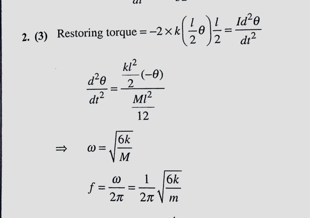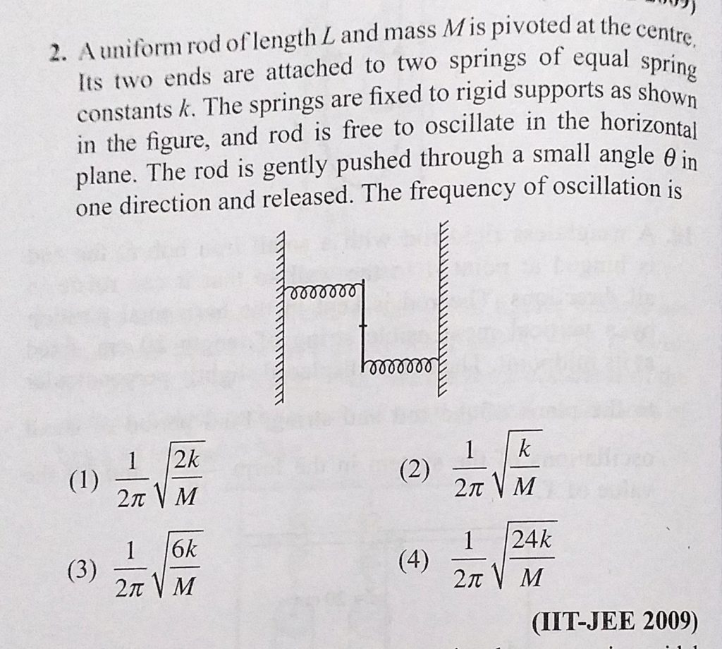 A uniform rod of length L and mass M is pivoted at the centre. Its two ends are attached to two springs of equal spring constants k. The springs are fixed to rigid supports as shown A uniform rod of length L and mass M is pivoted at the centre. Its two ends are attached to two springs of equal spring constants k. The springs are fixed to rigid supports as shown November 1, 2020 Category: Uncategorised (JEE Advanced Physics by BM Sharma + GMP Solutions) , Facebook Messenger WhatsApp Share this:TwitterFacebook Related