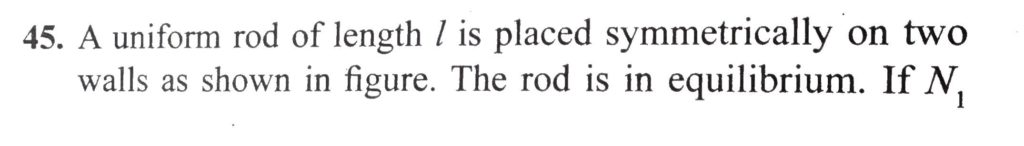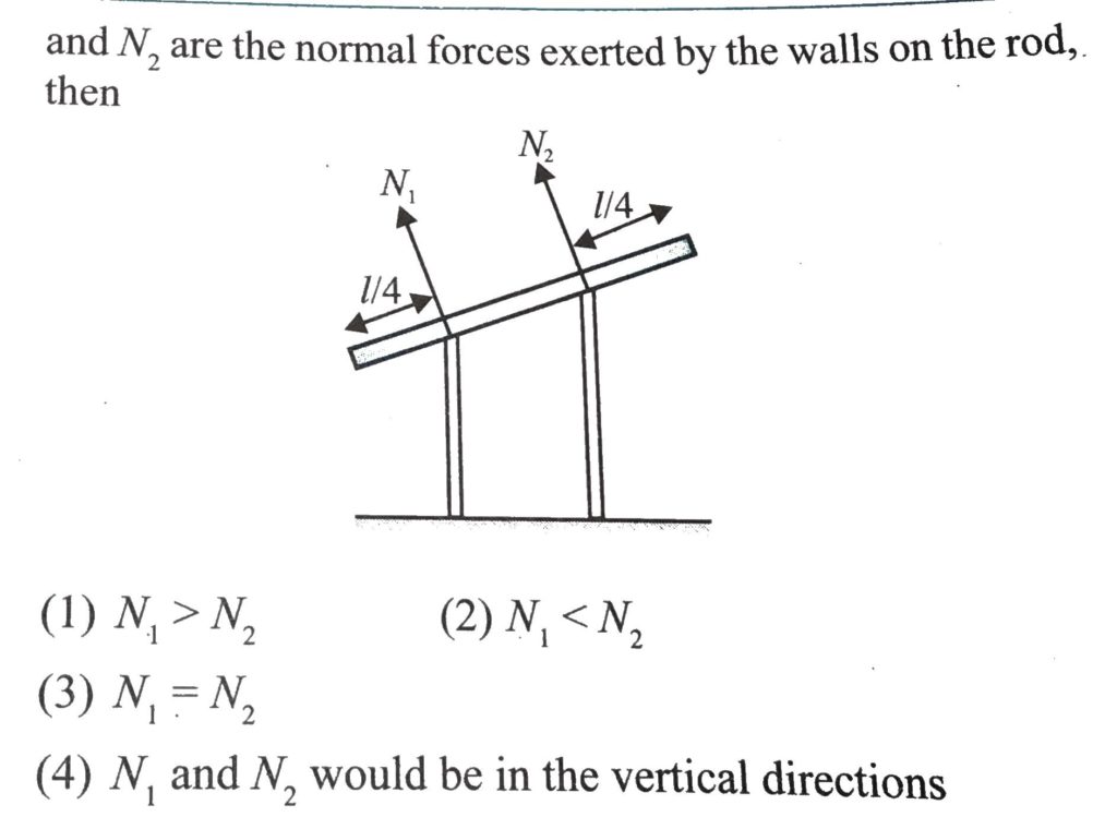 A uniform rod of length l is placed symmetrically on two walls as shown in figure. The rod is in equilibrium. If N1 and N 2 are the normal forces exerted by the walls on the rod then: A uniform rod of length l is placed symmetrically on two walls as shown in figure. The rod is in equilibrium. If N1 and N 2 are the normal forces exerted by the walls on the rod then: September 26, 2020 Category: Uncategorised (JEE Advanced Physics by BM Sharma + GMP Solutions) , Facebook Messenger WhatsApp Share this:TwitterFacebook Related