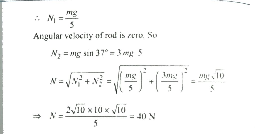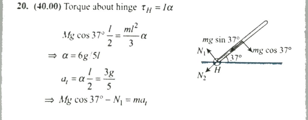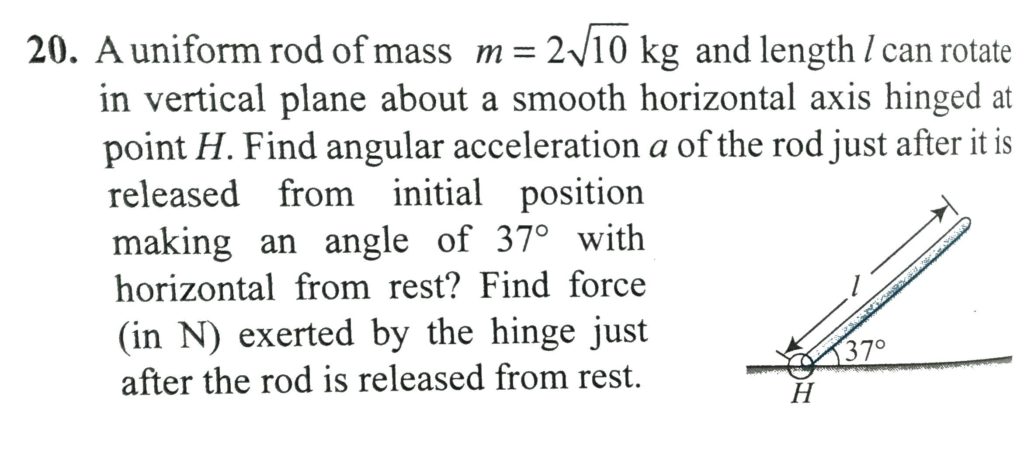 A uniform rod of mass m and length l can rotate in a vertical plane abota smooth horizontal axis hinged at point H. Find angular acceleraqtion a of the rod just after it is released from initial position making of 37 degree with horizontal from rest? Find force exerted by the hinge just after rod is released from rest.