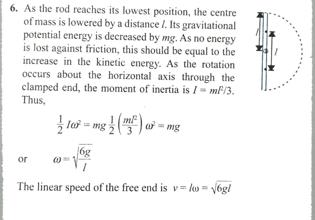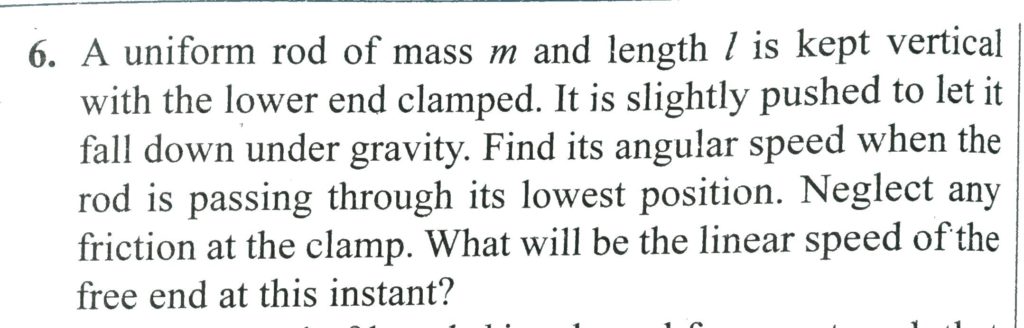 A uniform rod of mass m and length l is kept vertical with the lower end clamped. It is slightly pushed to let it fall down under gravity. Find its angular speed when the rod is passing through its lowest position. Neglect any friction at the clamp. What will be the linear speed of the free end at this instant?