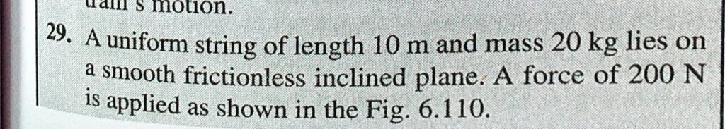 A uniform string of length 10 m and mass 20 kg lies on a smooth frictionless inclined plane. A force of 200 N is applied as shown in Fig. 6.110. A uniform string of length 10 m and mass 20 kg lies on a smooth frictionless inclined plane. A force of 200 N is applied as shown in Fig. 6.110. September 25, 2020 Category: Uncategorised (JEE Advanced Physics by BM Sharma + GMP Solutions) , Facebook Messenger WhatsApp Share this:TwitterFacebook Related