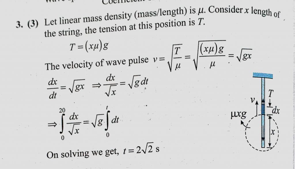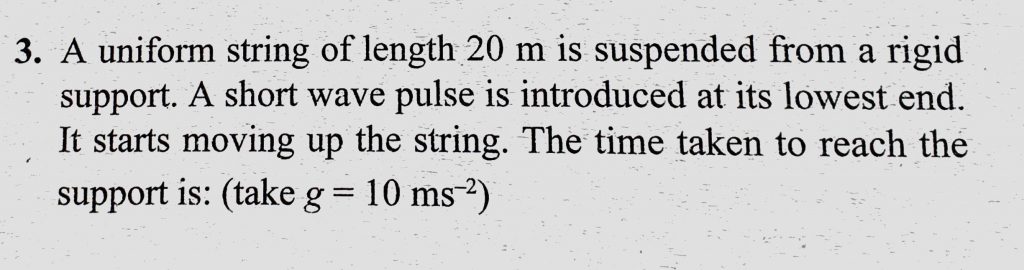 A uniform string of length 20 m is suspended from a rigid support. A short wave pulse is introduced at its lowest end. It starts moving up the string. The time taken to reach the support A uniform string of length 20 m is suspended from a rigid support. A short wave pulse is introduced at its lowest end. It starts moving up the string. The time taken to reach the support November 5, 2020 Category: Uncategorised (JEE Advanced Physics by BM Sharma + GMP Solutions) , Facebook Messenger WhatsApp Share this:TwitterFacebook Related