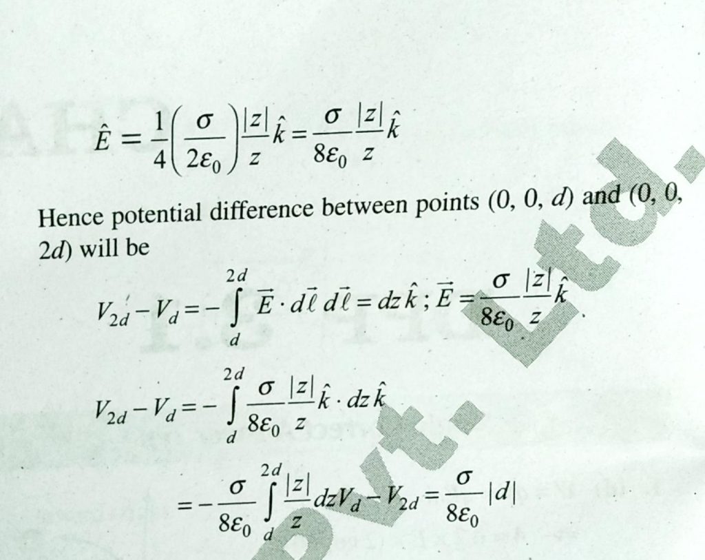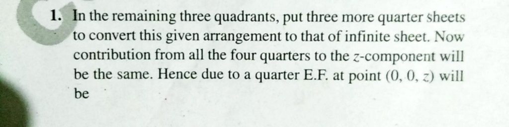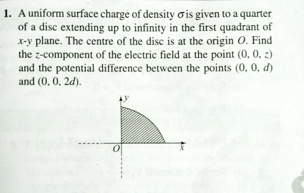 A uniform surface charge of density σ is given to a quarter of a disc extending up to infinity in the first quadrant of x-y plane. The centre of the disc is at the origin O. Find the z-component of the electric field at the point ( 0 ,0 ,z ) and the potential difference between the points ( 0, 0, d ) & ( 0, 0, 2d).