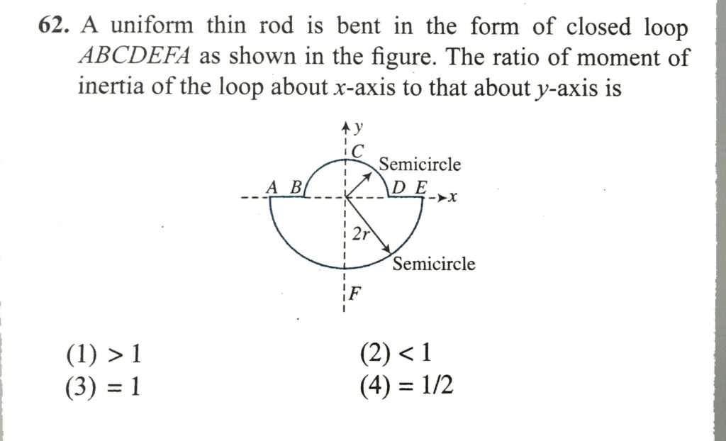A uniform thin rod is bent in the form of closed loop ABCDEFA as shown in fig. The ratio of moment of inertia of the loop about x-axis to that about y-axis is A uniform thin rod is bent in the form of closed loop ABCDEFA as shown in fig. The ratio of moment of inertia of the loop about x-axis to that about y-axis is September 26, 2020 Category: Uncategorised (JEE Advanced Physics by BM Sharma + GMP Solutions) , Facebook Messenger WhatsApp Share this:TwitterFacebook Related