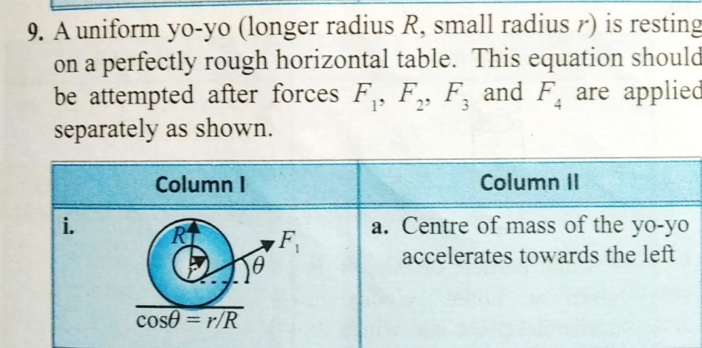 A uniform yo-yo (longer radius R, small radius r) is resting on a perfectly rough horizontal table. This equation should be attempted after forces F 1 ,F 2 ,F 3 and F 4 are applied separately as shown. A uniform yo-yo (longer radius R F 2 F 3 and F 4 are applied separately as shown. small radius r) is resting on a perfectly rough horizontal table. This equation should be attempted after forces F 1 September 30, 2020 Category: Uncategorised (JEE Advanced Physics by BM Sharma + GMP Solutions) , Facebook Messenger WhatsApp Share this:TwitterFacebook Related