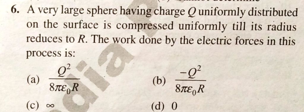 A very large sphere having charge Q uniformly distributed on the surface is compressed uniformly till its radius reduces to R. The work done by the electric forces in this process is A very large sphere having charge Q uniformly distributed on the surface is compressed uniformly till its radius reduces to R. The work done by the electric forces in this process is September 18, 2020 Category: Uncategorised (JEE Advanced Physics by BM Sharma + GMP Solutions) , Facebook Messenger WhatsApp Share this:TwitterFacebook Related
