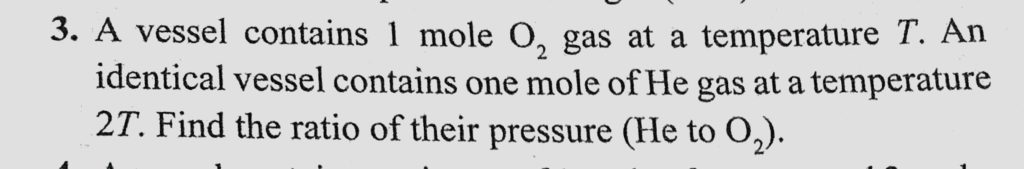 A vessel contains 1 mole o2 gas at a temperature T. An identical vessel contains one mole of He gas at a temperature 2T. Find the ratio of their pressure (He to o2). A vessel contains 1 mole o2 gas at a temperature T. An identical vessel contains one mole of He gas at a temperature 2T. Find the ratio of their pressure (He to o2). October 28, 2020 Category: Uncategorised (JEE Advanced Physics by BM Sharma + GMP Solutions) , Facebook Messenger WhatsApp Share this:TwitterFacebook Related