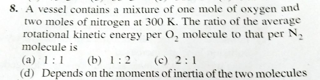 A vessel contains a mixture of one mole of oxygen and two moles of nitrogen at 300 k. THe ratio of the average rotational kinetic energy per o2 molecule to that per N2 molecule is A vessel contains a mixture of one mole of oxygen and two moles of nitrogen at 300 k. THe ratio of the average rotational kinetic energy per o2 molecule to that per N2 molecule is October 4, 2020 Category: Uncategorised (JEE Advanced Physics by BM Sharma + GMP Solutions) , Facebook Messenger WhatsApp Share this:TwitterFacebook Related