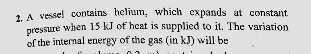 A vessel contains helium, which expands at constant pressure when 15 kJ of heat is supplied to it. The variation of the internal energy of the gas ( in kJ) will be A vessel contains helium which expands at constant pressure when 15 kJ of heat is supplied to it. The variation of the internal energy of the gas ( in kJ) will be October 29, 2020 Category: Uncategorised (JEE Advanced Physics by BM Sharma + GMP Solutions) , Facebook Messenger WhatsApp Share this:TwitterFacebook Related