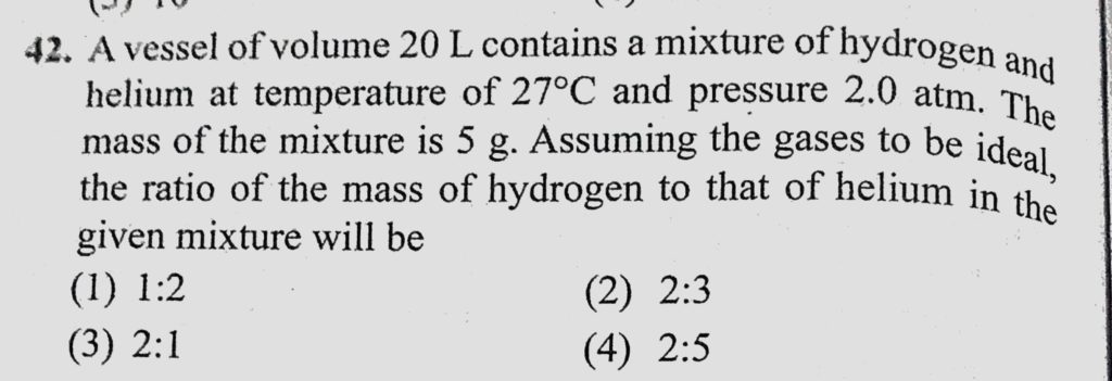 A vessel of volume 20 L contains a mixture of hydrogen and helium at temperature of 27 C and pressure 2.0 atm. The mass of the mixture is 5 g. Assuming the gases to be ideal, A vessel of volume 20 L contains a mixture of hydrogen and helium at temperature of 27 C and pressure 2.0 atm. The mass of the mixture is 5 g. Assuming the gases to be ideal October 27, 2020 Category: Uncategorised (JEE Advanced Physics by BM Sharma + GMP Solutions) , Facebook Messenger WhatsApp Share this:TwitterFacebook Related