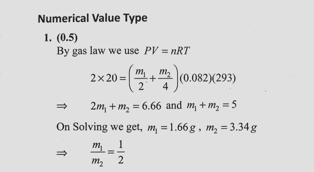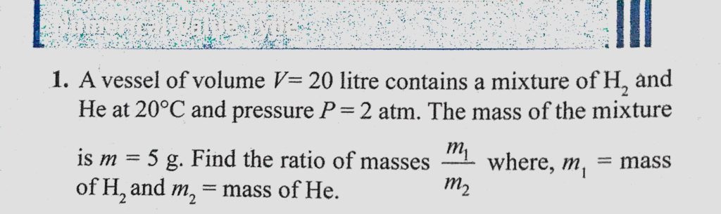 A vessel of volume V = 20 litre contains a mixture of H2 and He at 20 C and pressure P = 2 atm. The mass of the mixture is m = 5 g. Find the ratio of masses m1/m2 where m1 = mass of H2 A vessel of volume V = 20 litre contains a mixture of H2 and He at 20 C and pressure P = 2 atm. The mass of the mixture is m = 5 g. Find the ratio of masses m1/m2 where m1 = mass of H2 October 28, 2020 Category: Uncategorised (JEE Advanced Physics by BM Sharma + GMP Solutions) , Facebook Messenger WhatsApp Share this:TwitterFacebook Related
