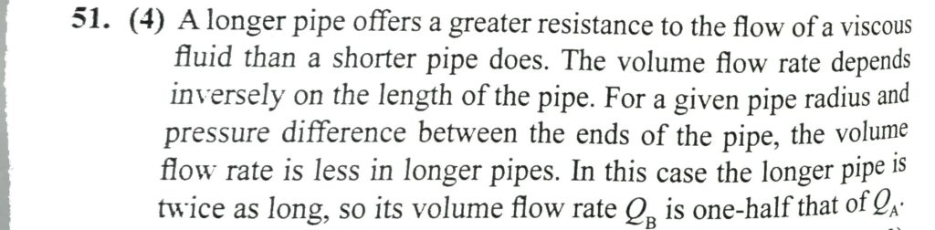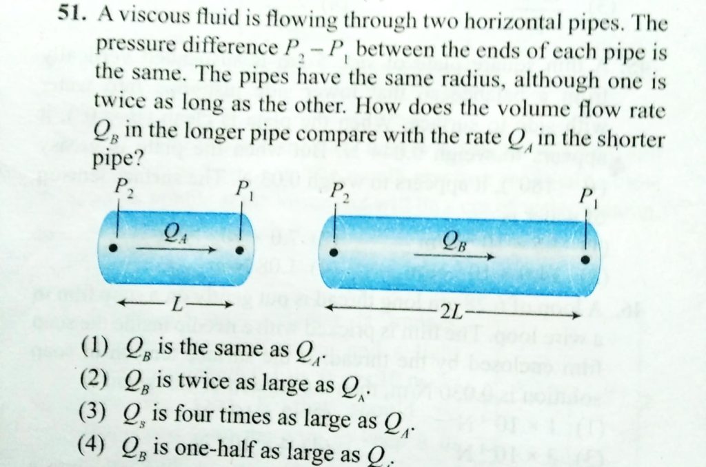 A viscous fluid is flowing through two horizontal pipes. the pressure difference p2 – p1 between the ends of each pipe is the same. the pipes have the same radius, although one is twice as long as the other. how does the volume flow rate Qb in the longer pipe compare with the rate Qa in the shorter pipe?