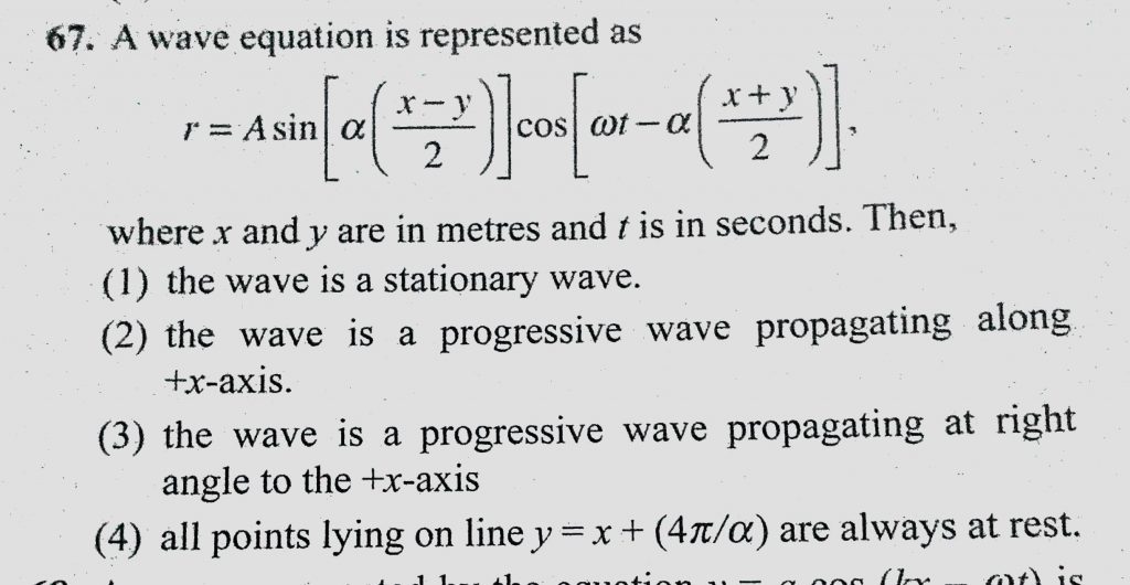 A wave equation is represented as r = A sin (alpha (x – y/2)) cos (omega t – alpha (x+y/2)), where x and y are in metres and t is in seconds. Then, A wave equation is represented as r = A sin (alpha (x - y/2)) cos (omega t - alpha (x+y/2)) where x and y are in metres and t is in seconds. Then November 6, 2020 Category: Uncategorised (JEE Advanced Physics by BM Sharma + GMP Solutions) , Facebook Messenger WhatsApp Share this:TwitterFacebook Related