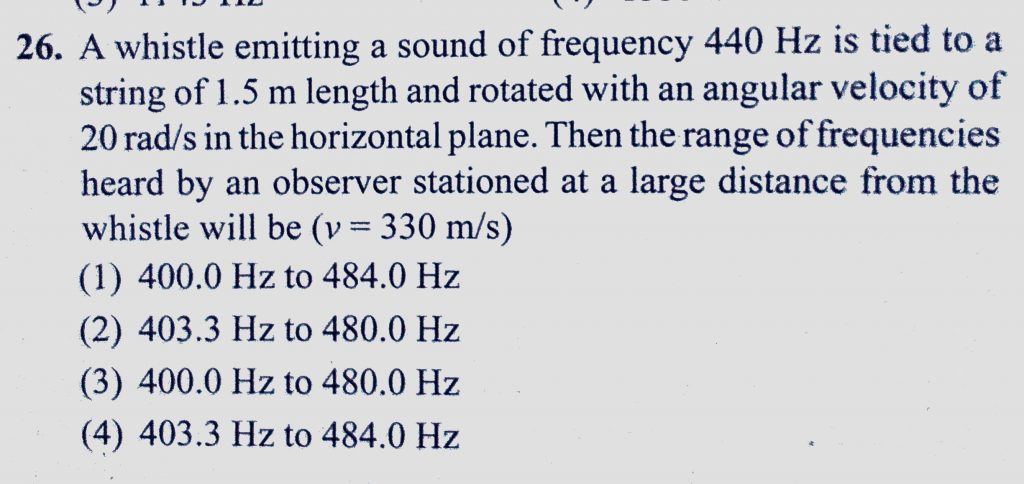 A whistle emitting a sound of frequency 440 Hz is tied to a string of 1.5 m length and rotated with an angular velocity of 20 rad/s in the horizontal plane. Then the range of frequencies A whistle emitting a sound of frequency 440 Hz is tied to a string of 1.5 m length and rotated with an angular velocity of 20 rad/s in the horizontal plane. Then the range of frequencies November 7, 2020 Category: Uncategorised (JEE Advanced Physics by BM Sharma + GMP Solutions) , Facebook Messenger WhatsApp Share this:TwitterFacebook Related