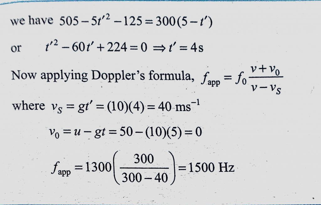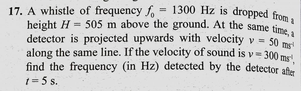 A whistle of frequency f0 = 1300 Hz is dropped from a height H = 505 m above the ground. At the same time, a detector is projected upwards with velocity v = 50 m/s a detector is projected upwards with velocity v = 50 m/s A whistle of frequency f0 = 1300 Hz is dropped from a height H = 505 m above the ground. At the same time November 8, 2020 Category: Uncategorised (JEE Advanced Physics by BM Sharma + GMP Solutions) , Facebook Messenger WhatsApp Share this:TwitterFacebook Related
