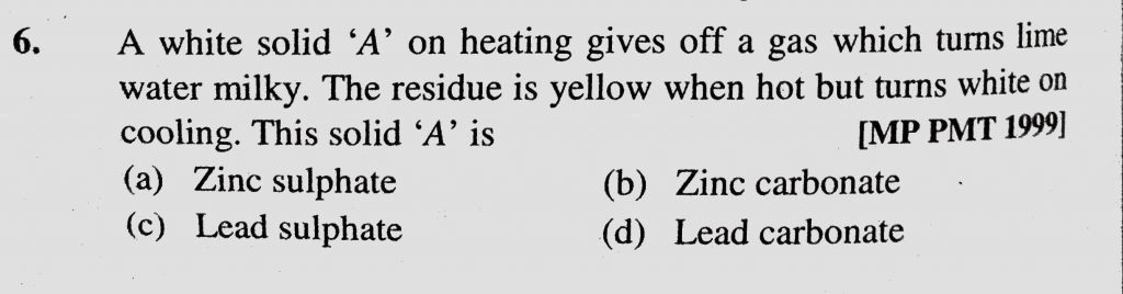 A white solid ‘A’ on heating gives off a gas which turns lime water milky. The residue is yellow when hot but turns white on cooling. This solid ‘A’ is A white solid 'A' on heating gives off a gas which turns lime water milky. The residue is yellow when hot but turns white on cooling. This solid 'A' is December 7, 2020 Category: Uncategorised (JEE Advanced Physics by BM Sharma + GMP Solutions) , Facebook Messenger WhatsApp Share this:TwitterFacebook Related
