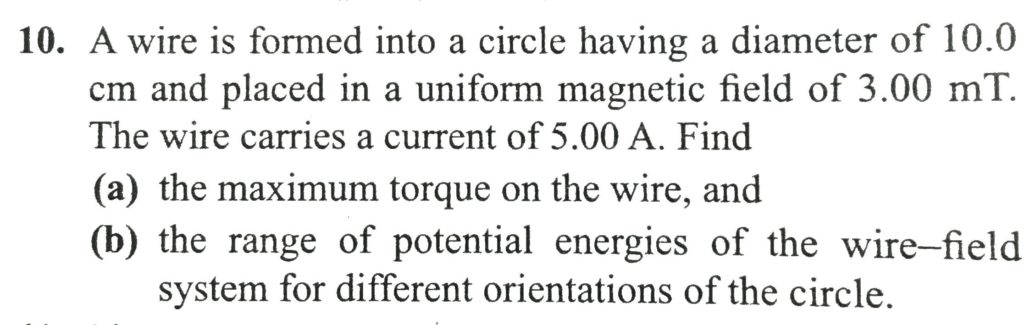 A wire is formed into a circle having a diameter of 10.0 cm and placed in a uniform magnetic field of 3.00 mT. The wire carries a current of 5.00 A. Find a. the maximum torque on the wire, and b. the range of potential energies of the wire-field system for different orientations of the circle.