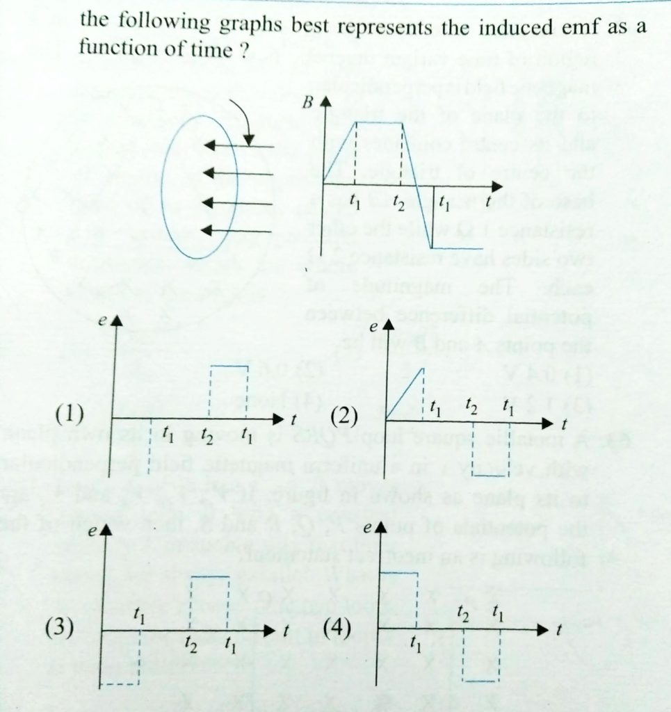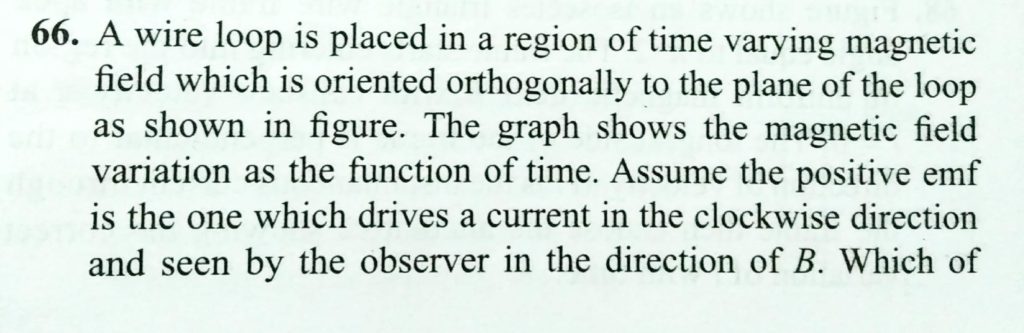 A wire loop is placed in a region of time varying magnetic field which is oriented orthogonally to the plane of the loop as shown in Fig. The graph shows the magnetic field variation as the function of time. Assume the positive emf is the one which drives a current in the clockwise direction and seen by the observer in the direction of B. Which of the following graphs best represents the induced emf as a function of time?