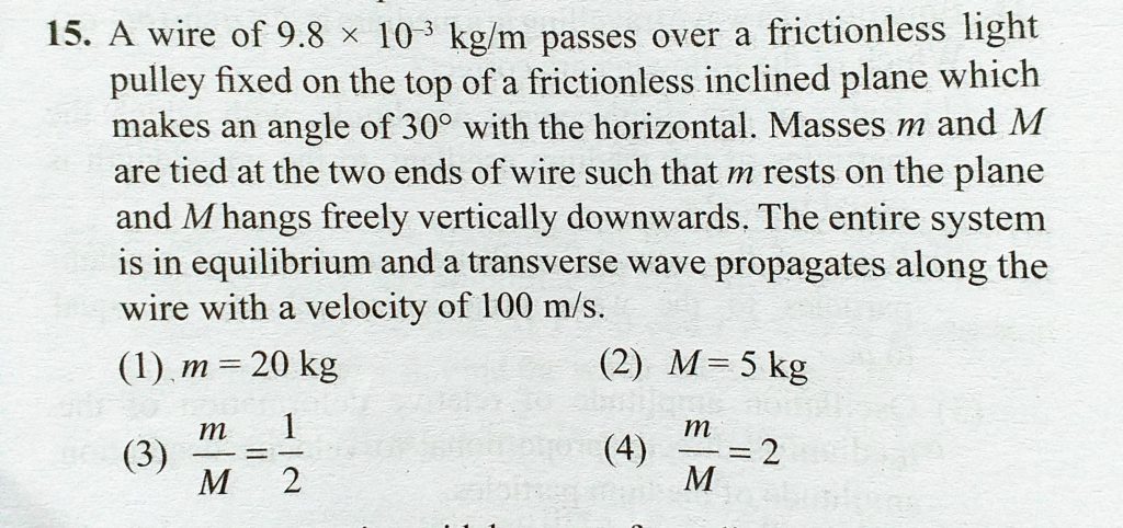 A wire of 9.8 * 10^-3 kg/m passes over a frictionless light pulley fixed on the top of a frictionless inclined plane which makes an angle of 30 with the horizontal. Masses m and M A wire of 9.8 * 10^-3 kg/m passes over a frictionless light pulley fixed on the top of a frictionless inclined plane which makes an angle of 30 with the horizontal. Masses m and M November 5, 2020 Category: Uncategorised (JEE Advanced Physics by BM Sharma + GMP Solutions) , Facebook Messenger WhatsApp Share this:TwitterFacebook Related