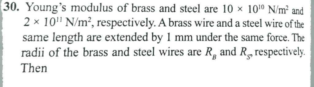 Young’s modulus of brass and steel are 10×10^10 N/m and 2 × 10^11 N/m^2, respectively. A brass wire and a steel wire of the same length are extended by 1mm under the same force. The radii of the brass and steel wires are RB and RS. respectively. Then