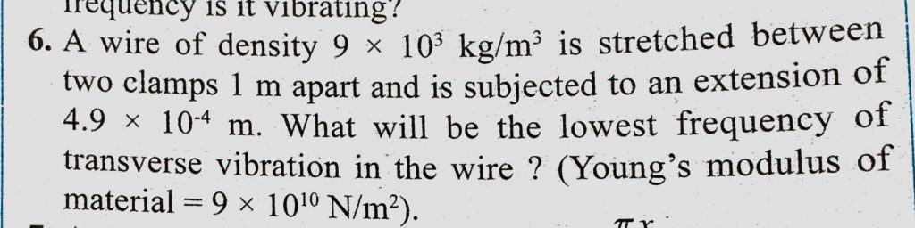 A wire of density 9 * 10^3 kg/m^3 is stretched between two clamps 1 m apart and is subjected to an extension of 4.9 * 10^-4 m. What will be the lowest frequency of transverse A wire of density 9 * 10^3 kg/m^3 is stretched between two clamps 1 m apart and is subjected to an extension of 4.9 * 10^-4 m. What will be the lowest frequency of transverse November 5, 2020 Category: Uncategorised (JEE Advanced Physics by BM Sharma + GMP Solutions) , Facebook Messenger WhatsApp Share this:TwitterFacebook Related