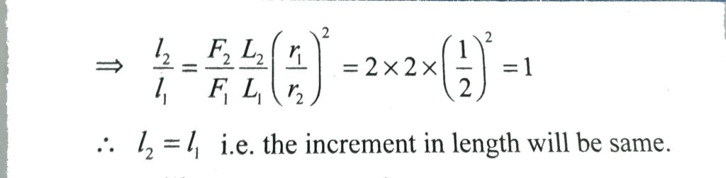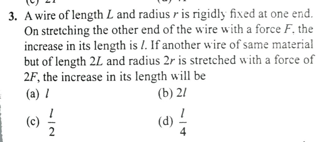 A wire of length L and radius r is fixed at one end. When a stretching force F is applied at free end, the elongation in the wire is l. When another wire of same material but of length 2L and radius 2r, also fixed at one end is stretched by a force 2F, the increase in its length will be