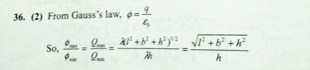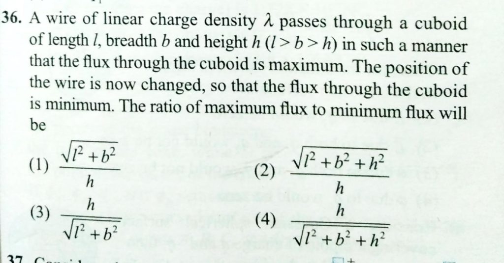 A wire of linear charge density λ passes through a cuboid of length l, breadth b and height h(lgtbgth) in such a manner that the flux through the cuboid is maximum. The position of the wire is now changed, so that the flux through the cuboid is minimum. The raito of maximum flux to minimum flux will be