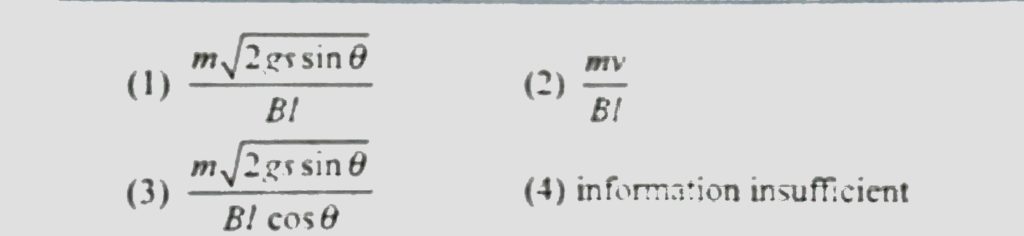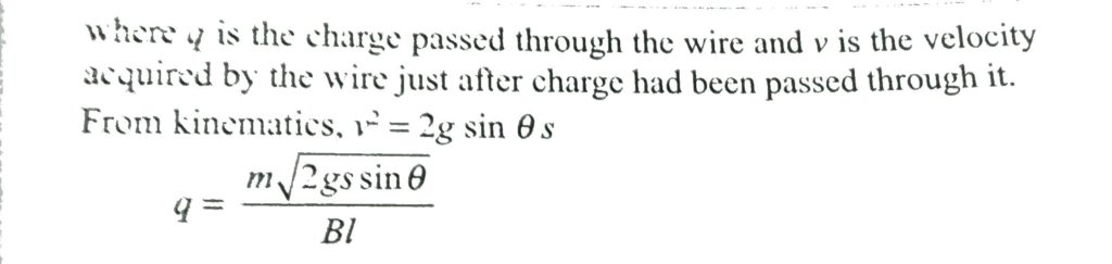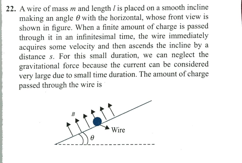 A wire of mass m and length l is placed on a smooth incline making an angle θ with the horizontal, whose fornt view is shown in Fig. When a finite amount of charge is passed through it in an infinitesimal time, the wire immediately acquires some velocity and then ascends the incline by a distance s. For this small duration, we can neglect the gravitational force because the current can be considered very large due to small time duration. The amount of charge passed through the wire is