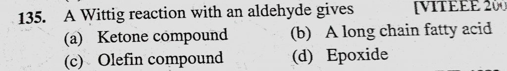 A wittig reaction with an aldehyde gives (a) Ketone compound (b) A long chain fatty acid (c) Olefin compound (d) Epoxide A wittig reaction with an aldehyde gives (a) Ketone compound (b) A long chain fatty acid (c) Olefin compound (d) Epoxide February 12, 2021 Category: Uncategorised (JEE Advanced Physics by BM Sharma + GMP Solutions) , Facebook Messenger WhatsApp Share this:TwitterFacebook Related