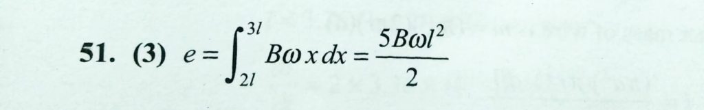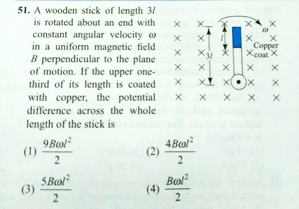 A wooden stick of length 3l is rotated about an end with constant angular velocity ω in a uniform magnetic field B perpendicular to the plane of motion. If the upper one-third of its length is coated with copper, the potential difference across the whole length of the stick is