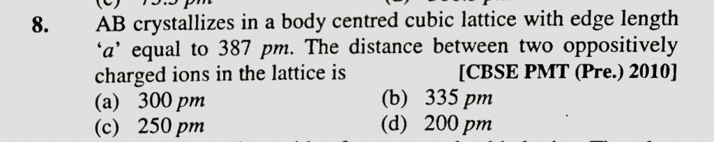 AB crystallizes in a body centred cubic lattice with edge length a equal to 387pm .The distance between two oppositely charged ions in the lattice is : AB crystallizes in a body centred cubic lattice with edge length a equal to 387pm .The distance between two oppositely charged ions in the lattice is : December 16, 2020 Category: Uncategorised (JEE Advanced Physics by BM Sharma + GMP Solutions) , Facebook Messenger WhatsApp Share this:TwitterFacebook Related