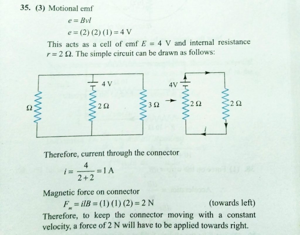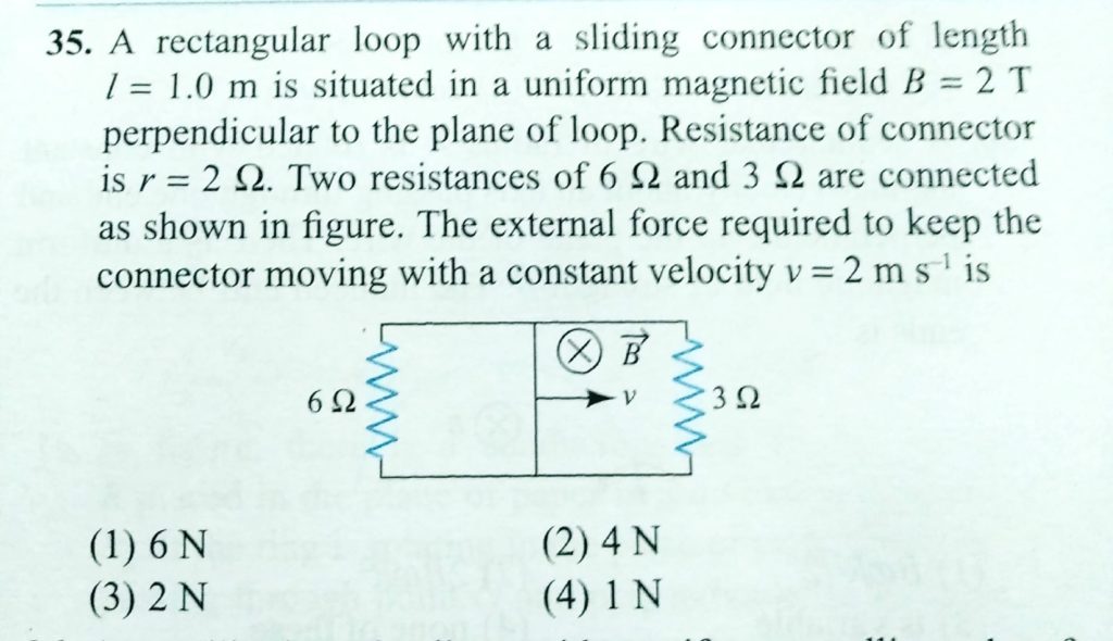 A rectangle loop with a sliding connector of length l = 1.0 m is situated in a uniform magnetic field B = 2 T perpendicular to the plane of loop. Resistance of connector is r = 2 Ω. Two resistance of 6Ω and 3Ω are connected as shown in figure. the external force required to keep the connector moving with a constant velocity v = 2 m/s is