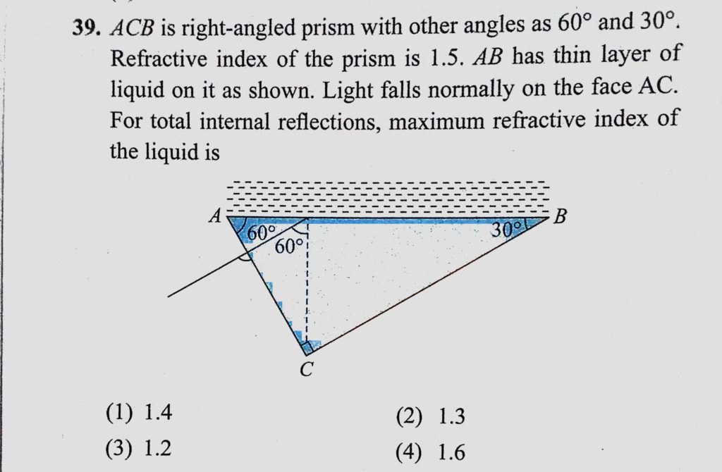 ACB is right angled prism with other angles as 60 and 30. Refractive index of the prism is 1.5. AB has thin layer of liquid on it as shown. Light falls normally on the face AC. For total internal reflections, The image of an object placed on the principal axis of a concave mirror of focal length 12 cm is formed at a point which is 10 cm more distance from the mirror than the object. October 6, 2020 Category: Uncategorised (JEE Advanced Physics by BM Sharma + GMP Solutions) , Facebook Messenger WhatsApp Share this:TwitterFacebook Related
