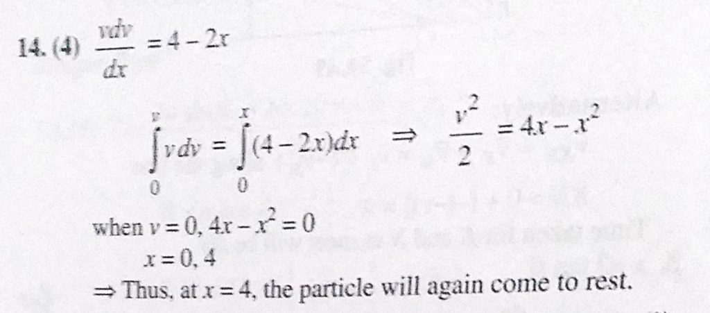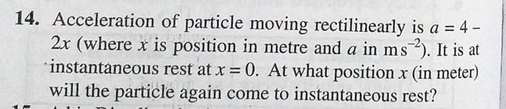 Acceleration of particle moving rectilinearly is a = 4 – 2x (where x is position in metre and a in m/s^2). It is at instantaneous rest at x = 0. At what position x ( in meter) will the particle again come to instantaneous A particle is moving in a circular path of radius 1 m. Under the action of a centripetal force the speed root 2 pie m/s of the particle is constant. Find the average velocity between A and B September 25, 2020 Category: Uncategorised (JEE Advanced Physics by BM Sharma + GMP Solutions) , Facebook Messenger WhatsApp Share this:TwitterFacebook Related