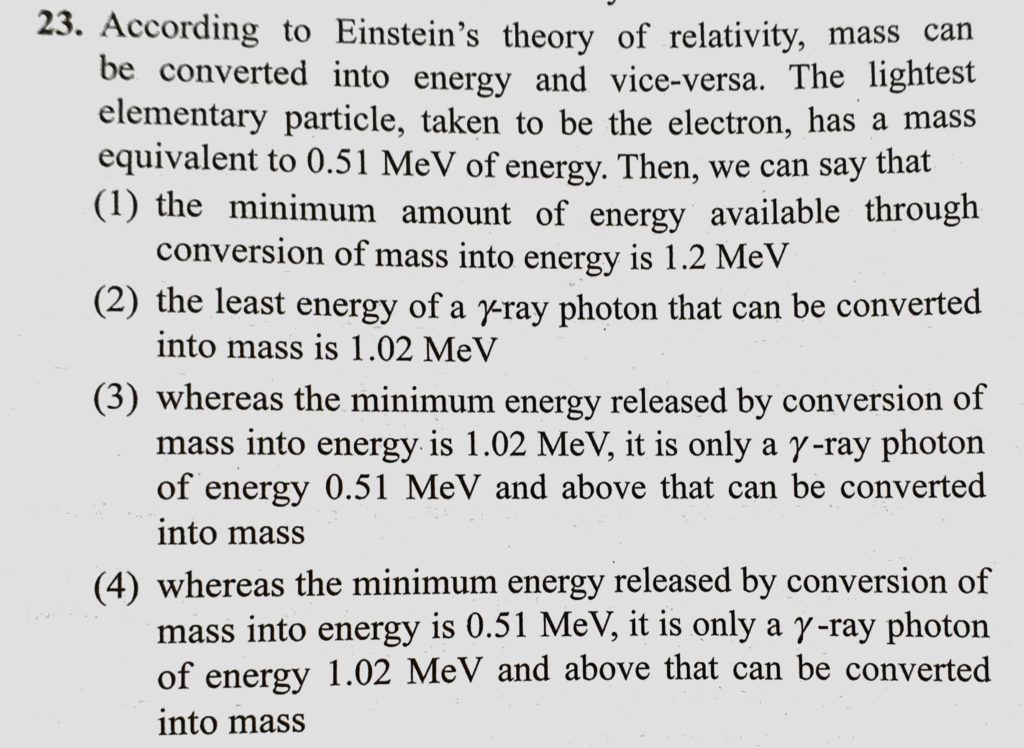 According to Einstein’s theory of relativity, mass can be converted into energy and vice-versa. The lightest elementary particle, taken to be the electron, has a mass equivalent to 0.51 MeV of energy. According to Einstein's theory of relativity has a mass equivalent to 0.51 MeV of energy. mass can be converted into energy and vice-versa. The lightest elementary particle taken to be the electron October 16, 2020 Category: Uncategorised (JEE Advanced Physics by BM Sharma + GMP Solutions) , Facebook Messenger WhatsApp Share this:TwitterFacebook Related